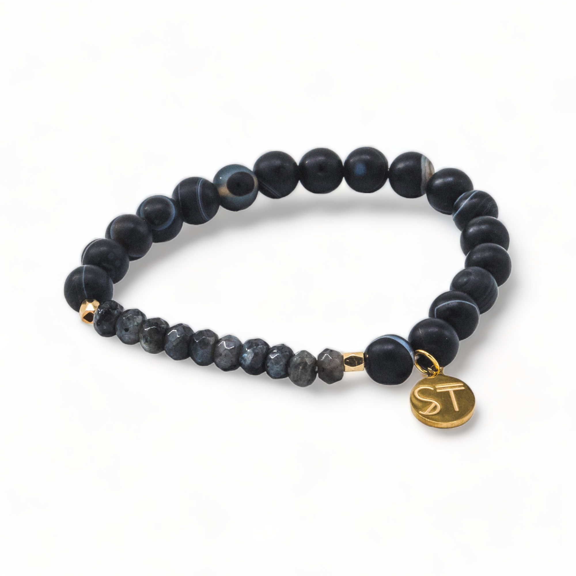 Handcrafted with 8mm Black Line Agate and Fated Labradorite Rondelle Beads, this handmade bracelet exudes a unique and stylish appeal. Featuring high-quality materials, it is sure to add an elegant touch to any outfit.